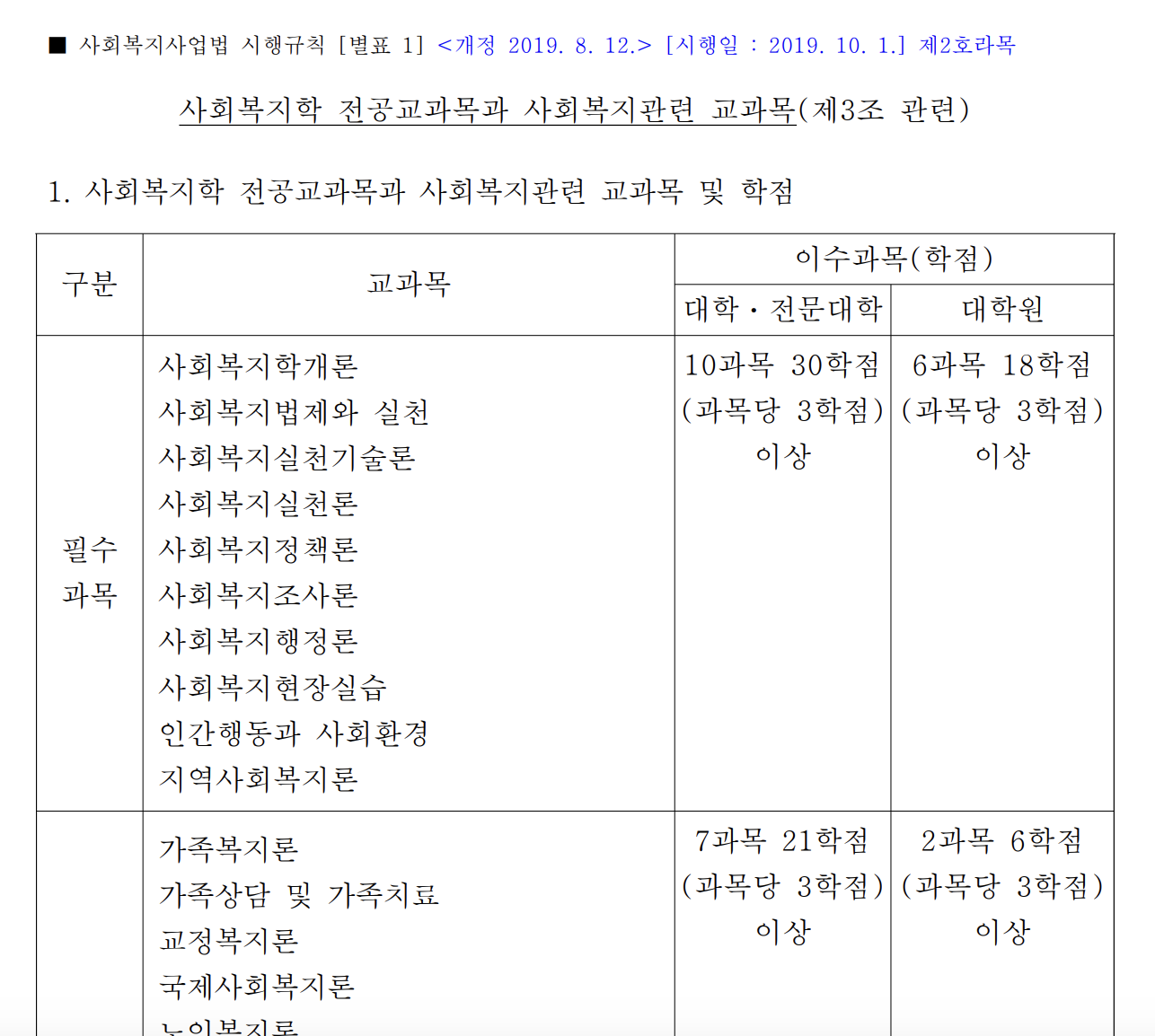 필수과목과 선택과목을 정확히 확인하는 방법은 "사회복지사업법 시행규칙 별표1"에서 볼 수 있으니 참고하시기 바랍니다.
