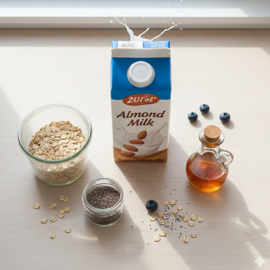 | ✅ 실패 없는 기본 레시피 (1인분 기준) • 필수 재료: 롤드 오트 1/2컵, 우유 또는 두유 1/2컵, 치아씨드 1 작은술 • 선택 재료: 그릭 요거트 1/4컵 (꾸덕한 식감 선호 시), 꿀 또는 시럽 1 작은술 • 토핑 예시: 블루베리, 바나나 슬라이스, 아몬드 슬라이스 |