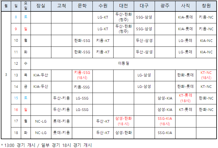 올해는 일부 구장 공사 일정에 맞춰 경기가 조정되었으며, 야간 경기 유연성을 위해 특정 경기만 18시 시작으로 변경되었습니다.