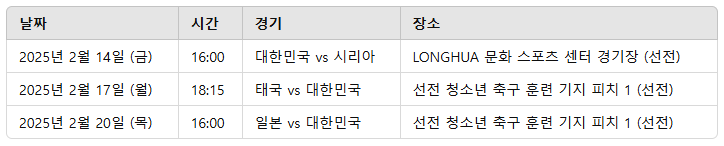 A2: 대한민국의 첫 번째 경기는 2025년 2월 6일 태국과 상하이 스타디움에서 펼쳐집니다.