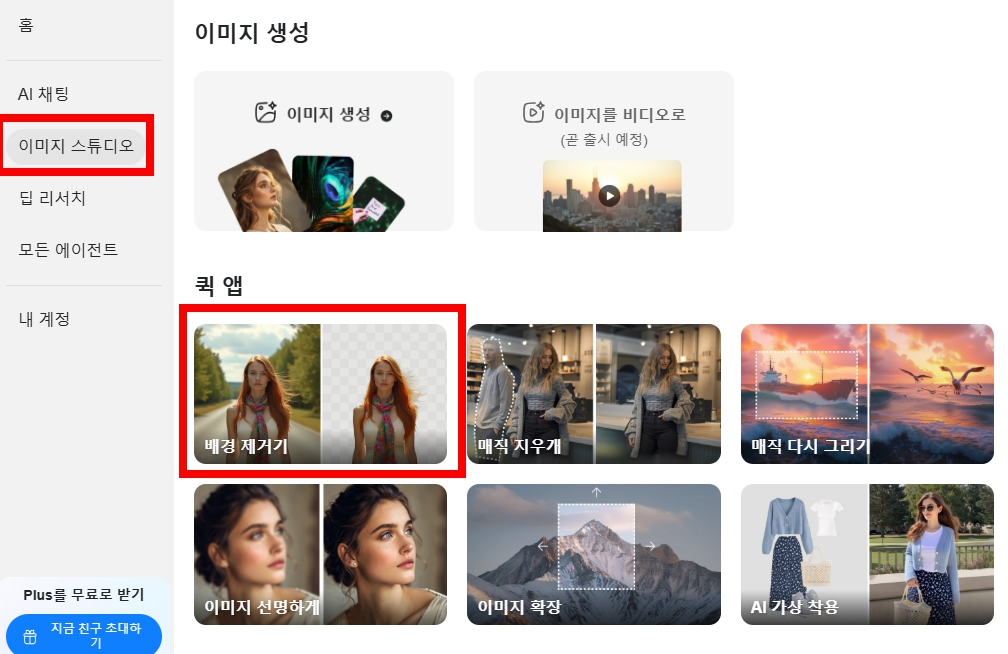 - "이미지 스튜디오"에서 "퀵 앱" → "배경제거기" 선택